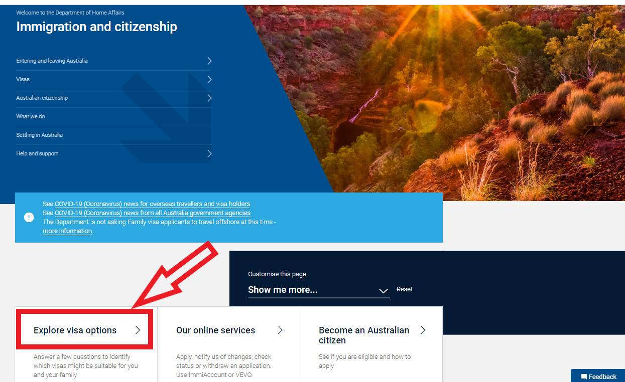 Starting at the 'Immigration and Citizenship' section of the Department of Home Affairs website, select the ‘Explore Visa Options’ tab. This section is a broad overview of the categories of Australian visas – from Visitor, to Work and Study, all the way through Refugee and Humanitarian visas.